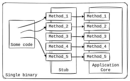 A stub has the same interface as application cores behind it. It is possible to implement another stub that will be pointing directly to a core. A lock is added for a core to avoid concurrent updates. This is essentially a non-replicated non-sharded version of the same application. Internally there might be actually multiple shards since each core is essentially single-threaded on updates, but all those cores are running in a single process and this process is nonclustered as the result.