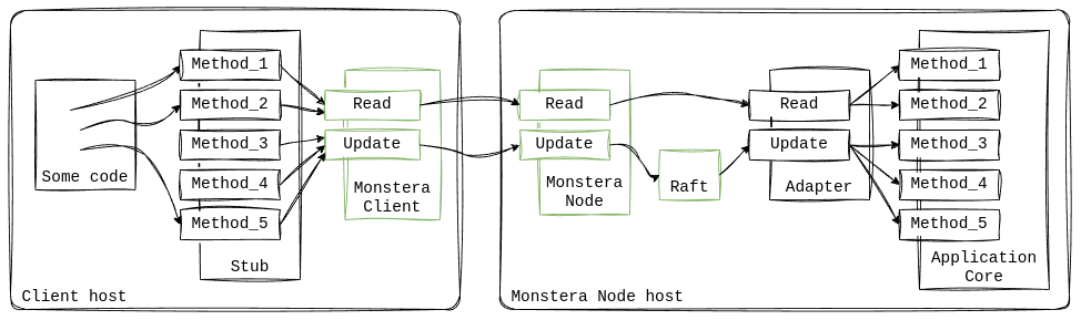 A nonclustered stub is code-generated by Monstera tooling.